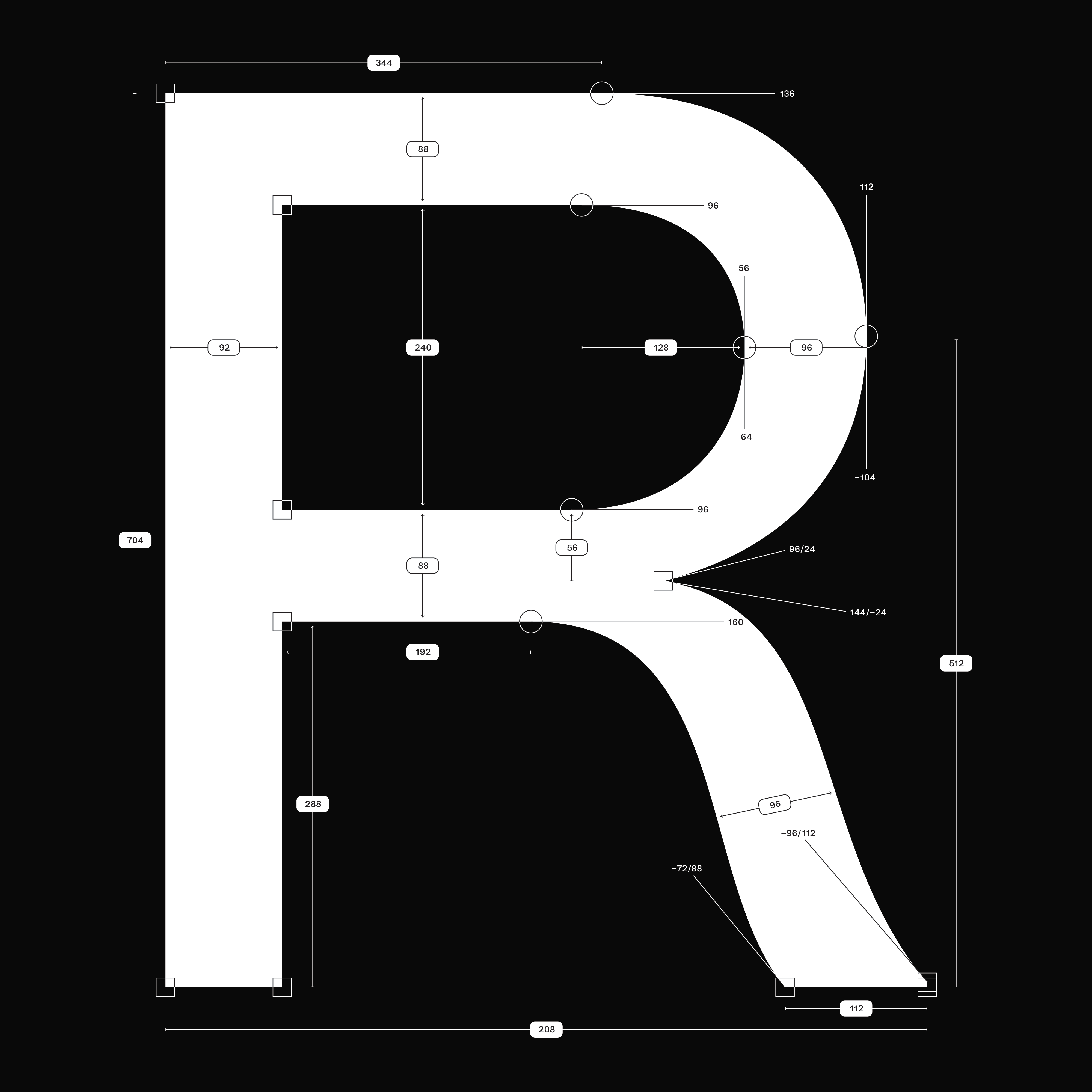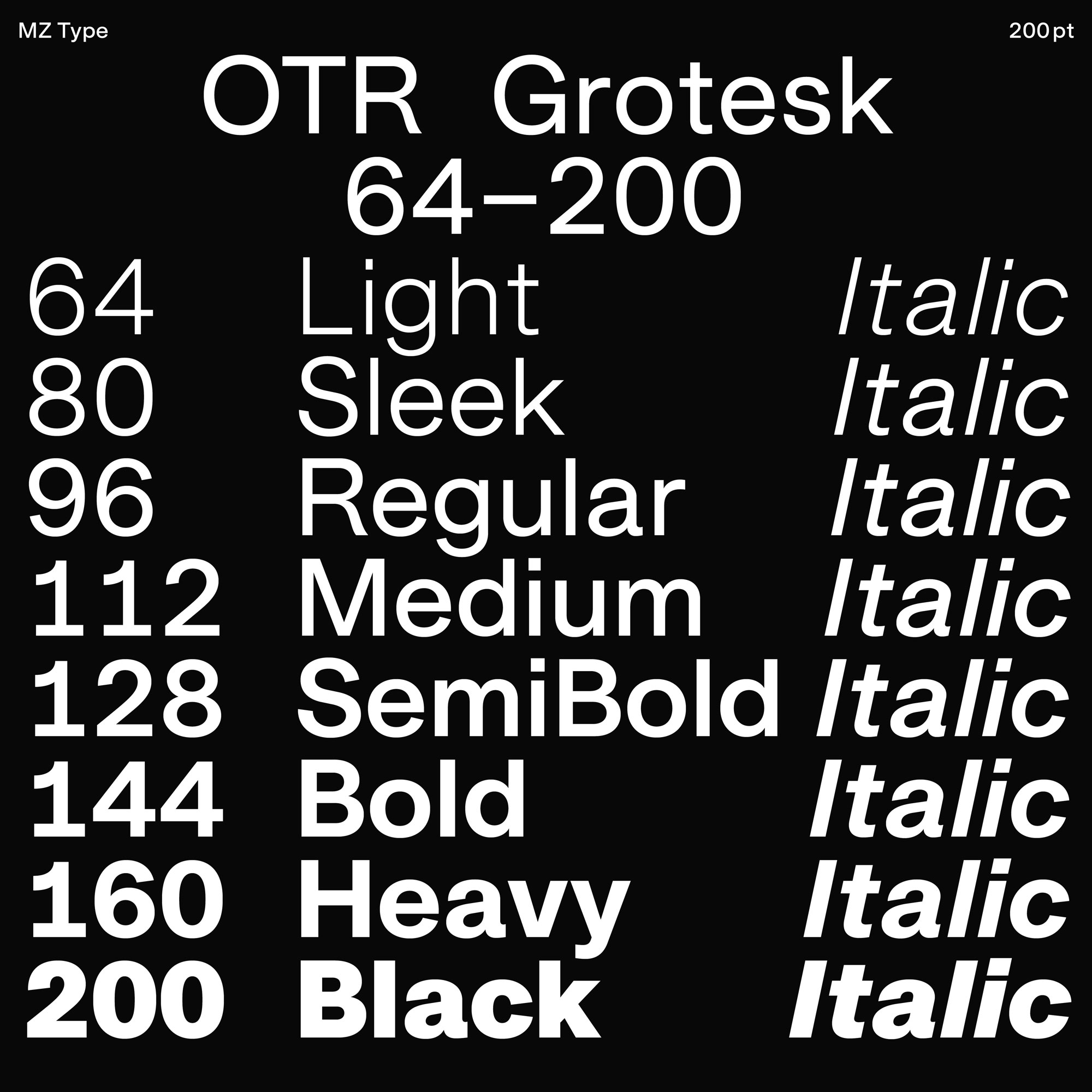 The underlying structure of OTR Grotesk follows a very strict grid – based on the unit 8 – for everything from sizes and spacing to interpolation. Thus, also the generated font styles of OTR Grotesk are almost linear and range from 80 Light to 200 Black. While the classic approach, to distribute the weights nonlinear along the axis, creates a more balanced rhythm between each font style, I sometimes miss more subtle leaps between Light and Medium styles. This fact and the soon-to-be-commonplace variable fonts technique, which allows to seamlessly choose every weight on the defined Weight Distribution range, supported me in this decision.