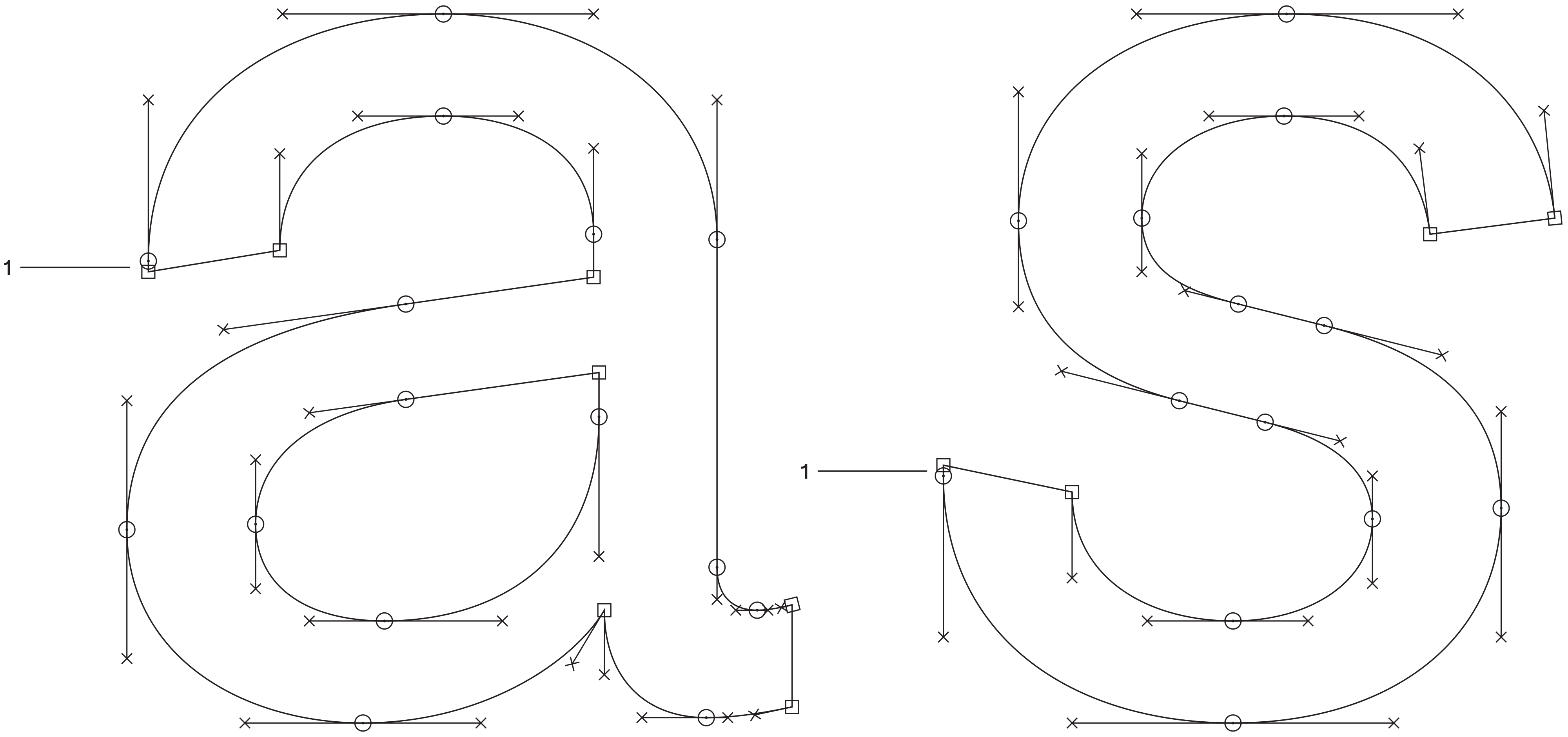 A very pragmatic way to design the overhanging terminals was eventually found in elongating the extrema of the curves into a straight Design line, which works well in all weights and even slanted glyphs.¹.